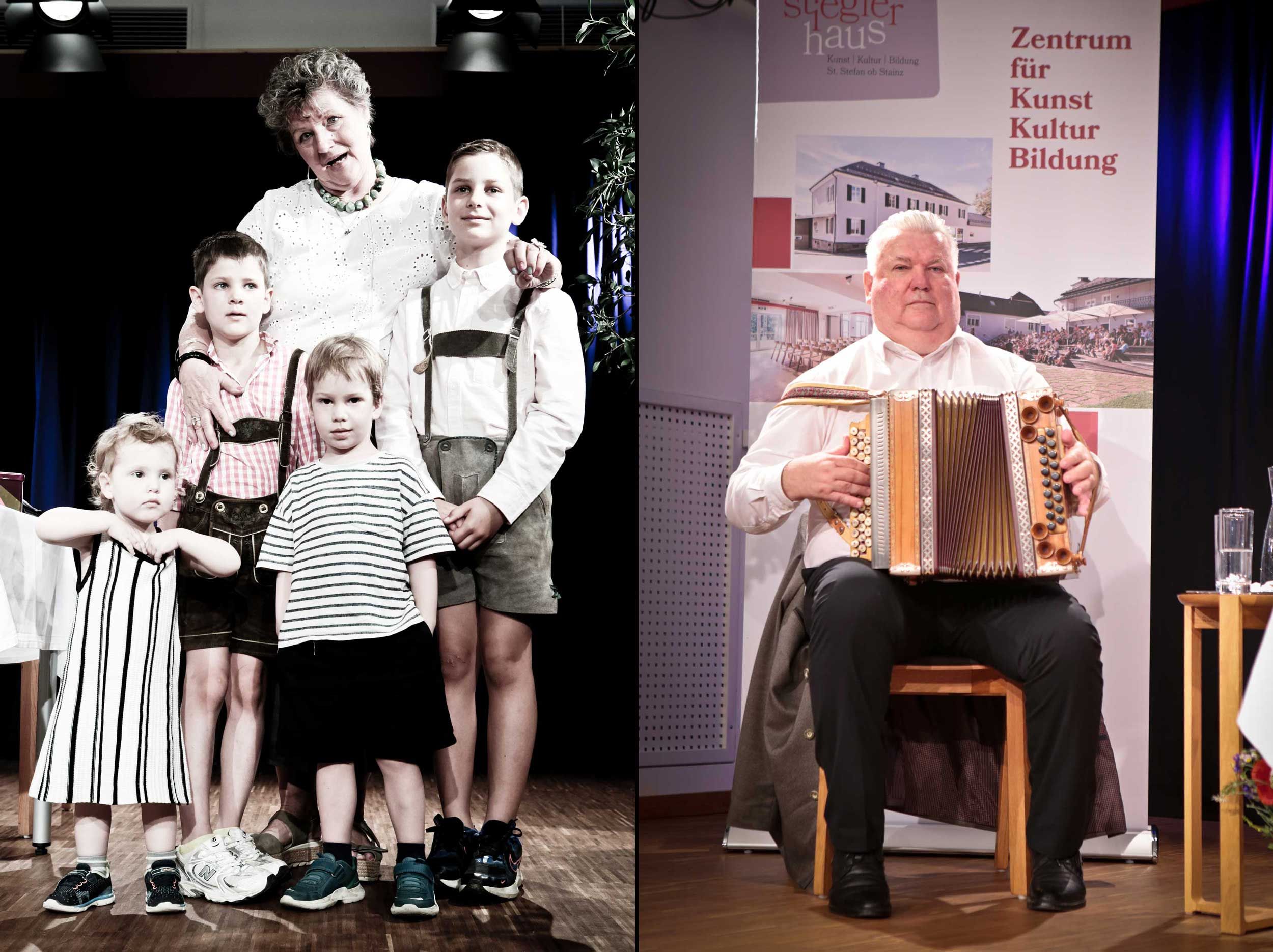 Musikalisch wunderbar begleitet durch Vater und Sohn. Sie arbeiten nicht nur in der biologischen Landwirtschaft erfolgreich zusammen, auch als musikalisches Duo auf der steirischen Harmonika, dem Bariton und der Zungentrommel haben Leo und Florian Friesenecker das Publikum schwungvoll mitgerissen.